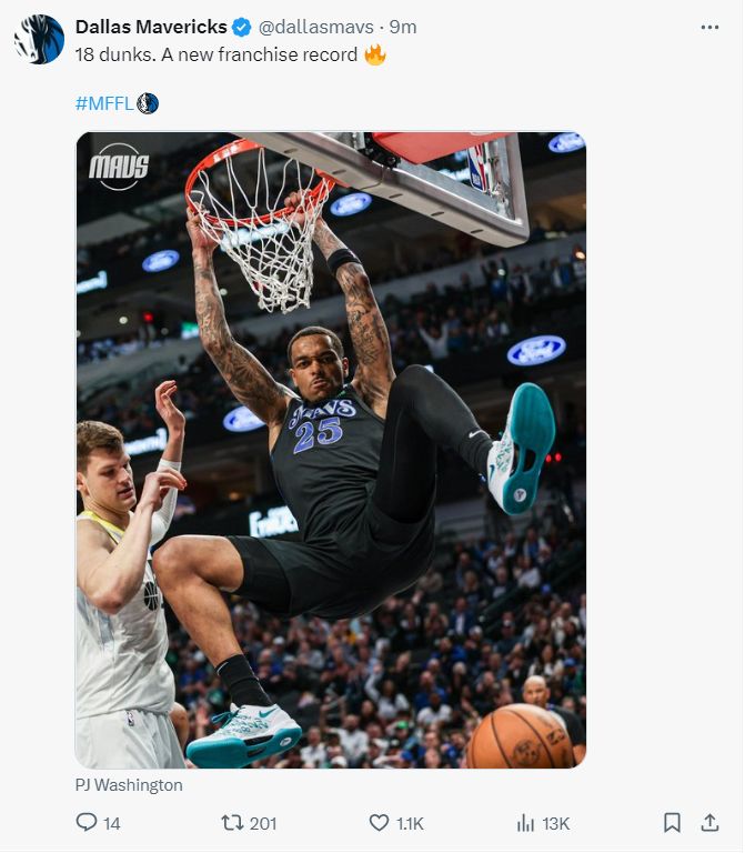 这场比赛达拉斯独行侠创造了一项队史纪录——单场18次暴扣,这对于此前一直都依赖三分球的进攻大队来说实属罕见。