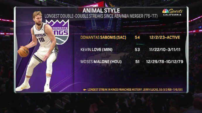 其三,小萨连续54场两双,继续刷新国王队史最长纪录。
