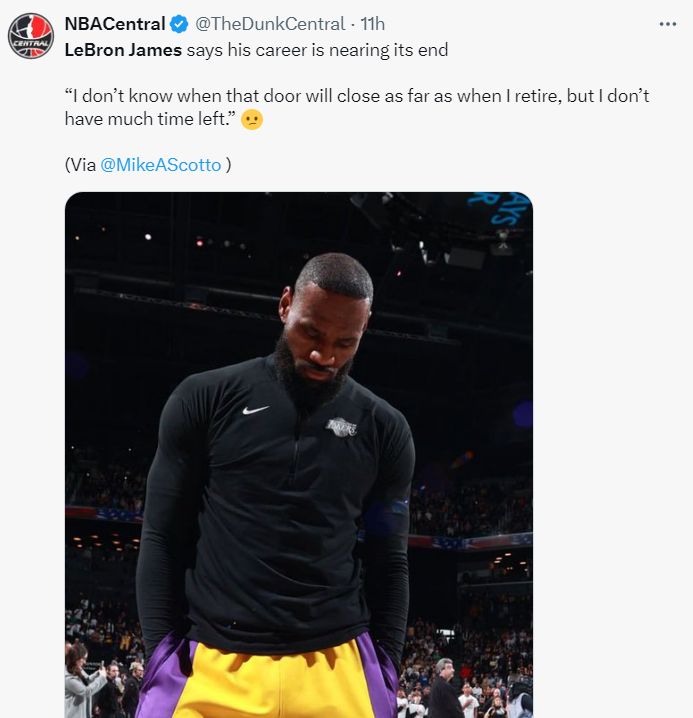 赛后勒布朗在采访中被问及何时退役的话题,他回答:“我已经在山的另一面,我不可能再打21个赛季,我在联盟的时间已经不多了,但我还不知道我什么时候退役。”