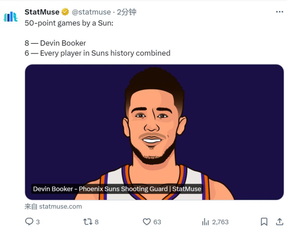 布克生涯第8次50+得分,追平恩比德、字母哥与伯纳德金并列历史第13位。