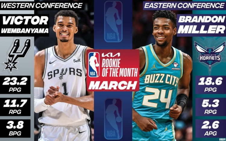 24直播网4月3日讯,今日,NBA官方公布了三月份月最佳新秀得主,马刺状元文班亚马当选西部月最佳新秀,黄蜂榜眼布兰登-米勒当选东部月最佳新秀。