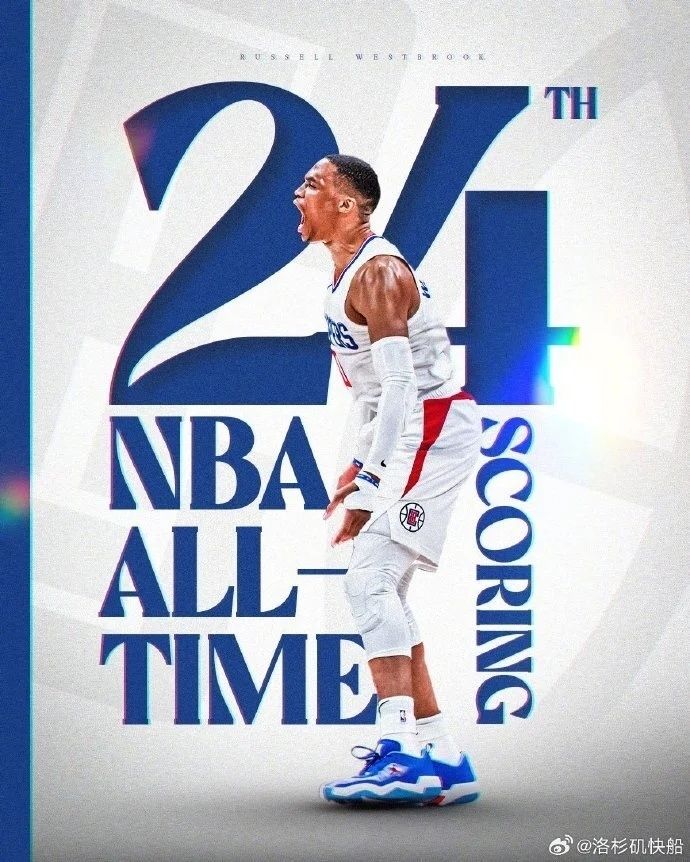 其六,威少以生涯总分超过杰里·韦斯特,NBA历史分榜上升至24位。