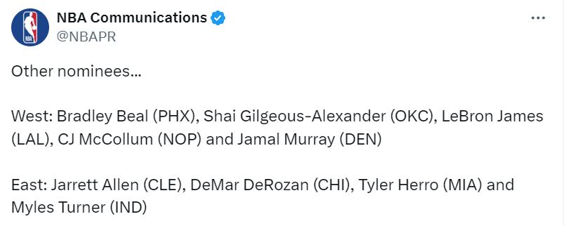 北京时间4月16日,NBA官方公布了第25周,也是常规赛最后一周的周最佳球员。掘金的约基奇当选西部周最佳,这是约基奇生涯第14次当选周最佳,也是本赛季第2次获得这一奖项。尼克斯的布伦森当选东部周最佳,这是布伦森生涯第5次当选周最佳,也是本赛季第4次获此殊荣。詹姆斯上周场均32.7分9篮板11助攻3抢断,获得周最佳的提名。