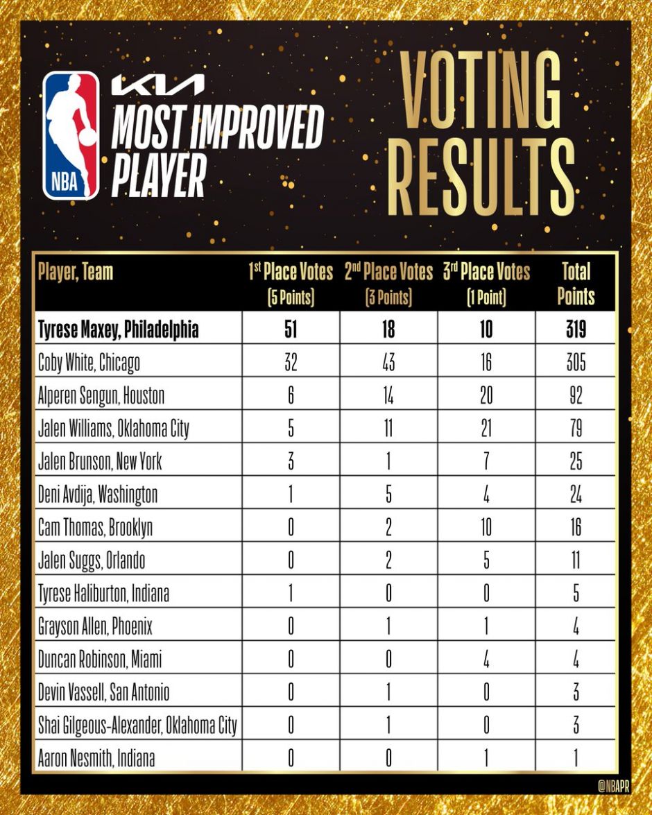 马克西场均25.9分3.7篮板6.2助攻,场均得分比上赛季提升5.6分。科比-怀特场均19.1分4.5篮板5.1助攻,场均得分比上赛季提升9.4分。申京场均21.1分9.3篮板5助攻,场均得分比上赛季提升6.3分。论得分的进步幅度,马克西比不上两位对手,但他在生涯第4季入选全明星。在三位候选人中,进入季后赛的也只有马克西。