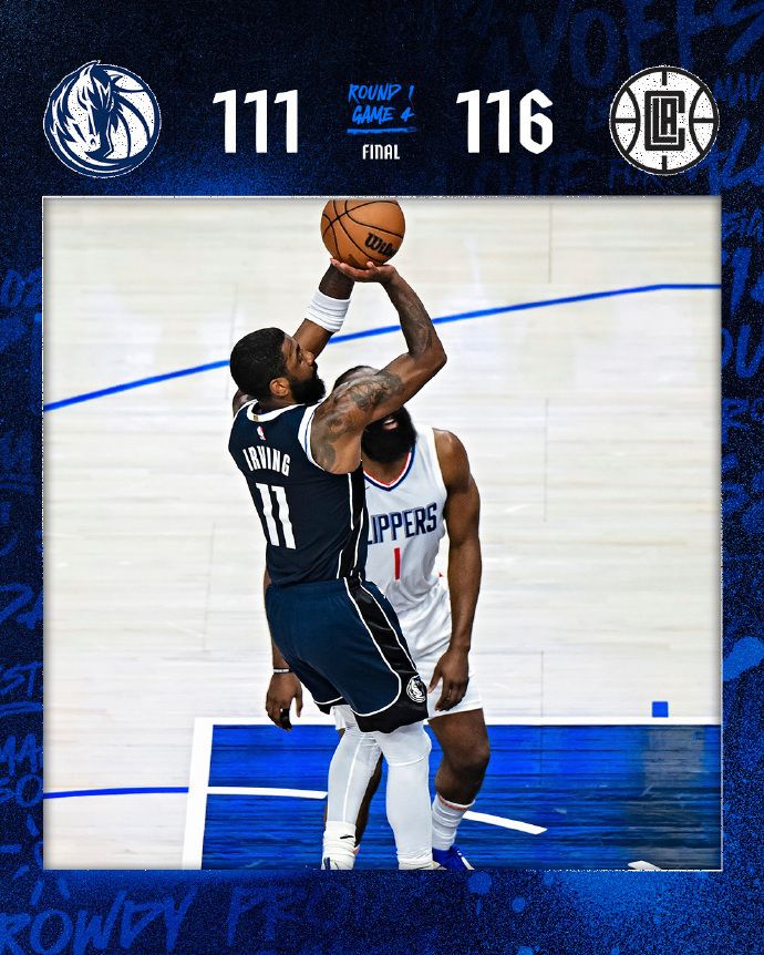 北京时间4月29日,NBA季后赛首轮G4快船客场对阵独行侠,快船核心莱昂纳德因伤缺席。快船在乔治与哈登引领下,连续三分雨攻势在次节前半段扩大最多领先31分优势。东契奇与欧文率领独行侠顽强反扑,并在末节最后阶段反超比分,乔治与哈登连续关键得分重新反超比分,最终独行侠111-116惜败,总分被追到2-2拖进天王山之战,成为西部唯一一组2-2,下场天王山之战回到快船主场比赛。东契奇29+10+10与欧文40分仍无力回天,遗憾加入空砍群。
