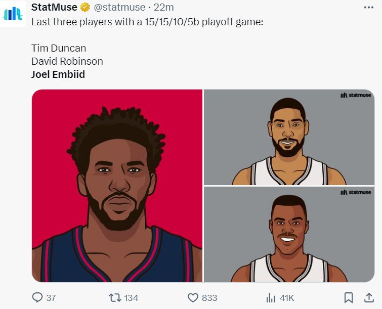 不过恩比德成为过去30年费城队史第二位季后赛三双的球员,也是队史第六位季后赛三双球员,季后赛单场至少15+15+10+5盖帽是大卫罗宾逊、邓肯后首人。