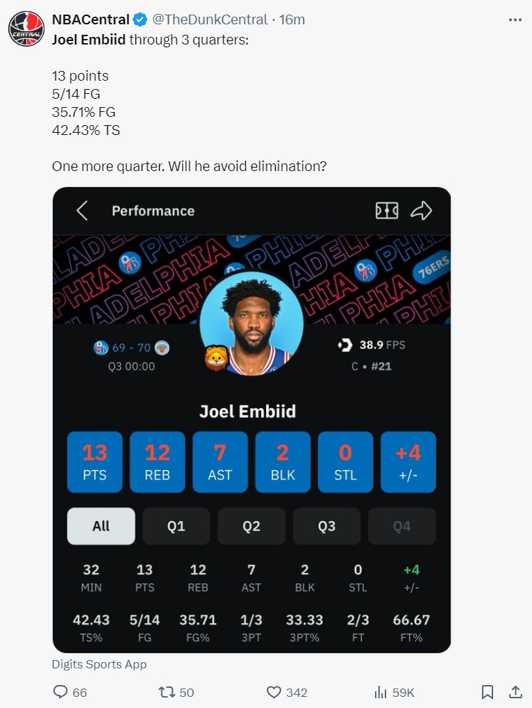 恩比德季后赛10场淘汰赛只有1场命中率超过50%,延续耻辱纪录。