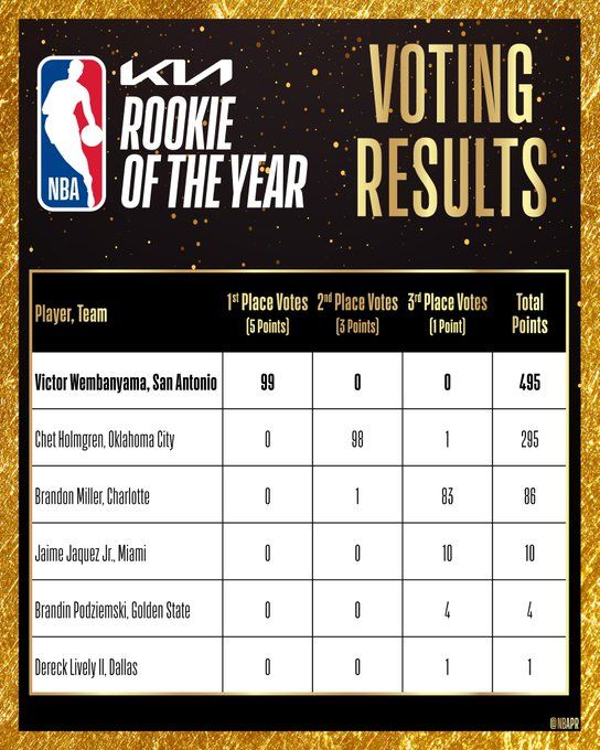文班得到全部99张第一选票,全票当选最佳新秀,成为历史上第6位做到这一点的球员。霍姆格伦295分,米勒86分。此前有5位NBA球员全票当选最佳新秀,他们分别是拉尔夫-桑普森、大卫-罗宾逊、布雷克-格里芬、达米安-利拉德和唐斯。
