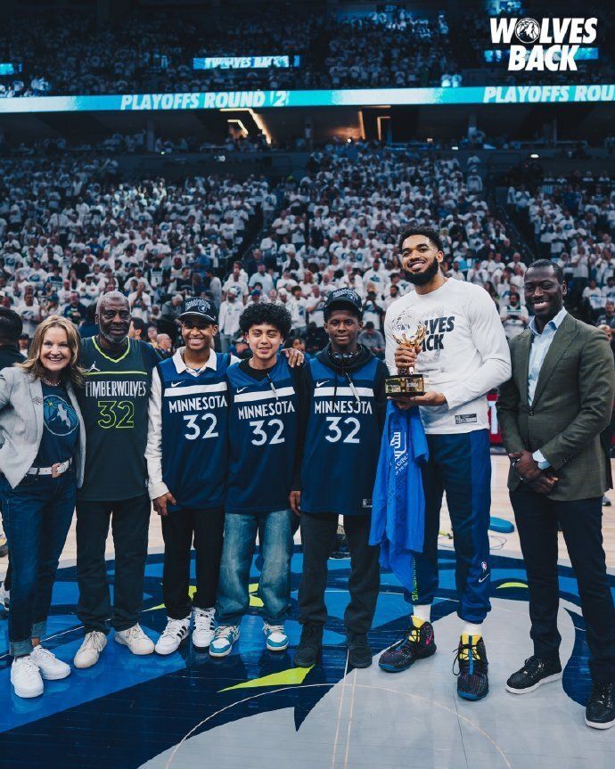 如今森林狼在次轮G3回到主场比赛,赛前森林狼在主场进行颁奖仪式,先是唐斯领取了自己的社会正义奖,他高举奖杯,并且与自己的家人在场地中央合影。