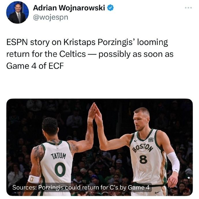 根据名记Woj报道,波尔津吉斯最快有望东决G4复出,但凯尔特人也并不着急让他立即复出,但他距离能够复出比赛越来越接近。