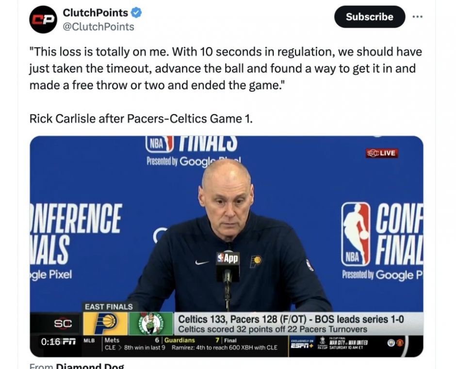 北京时间5月22日,步行者在东决首战加时128-133惜败凯尔特人,他们末节最后时刻领先3分出现致命失误,且没有叫暂停布置与进行战术犯规,连续犯错让他们痛失好局。赛后步行者主帅卡莱尔表示输球完全是他的责任,检讨了最后时刻的战术布置不当,却也透露布置了犯规战术,但尊重西亚卡姆不犯规的选择,他拒绝谈论罚球10-30相差20个的悬殊差距。