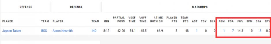 塔图姆G1轰下36分12篮板4助攻3抢断,投篮26中12,三分8中2,个人正负值+20全队最高。这样的表现看上去除了三分命中率低一些,似乎没啥问题。特别是他在关键的加时赛还独得10分。可是这场比赛的具体防守数据出来后,你会发现步行者的内史密斯,也就是塔图姆的绿军前队友,确实给他制造了不小的麻烦。