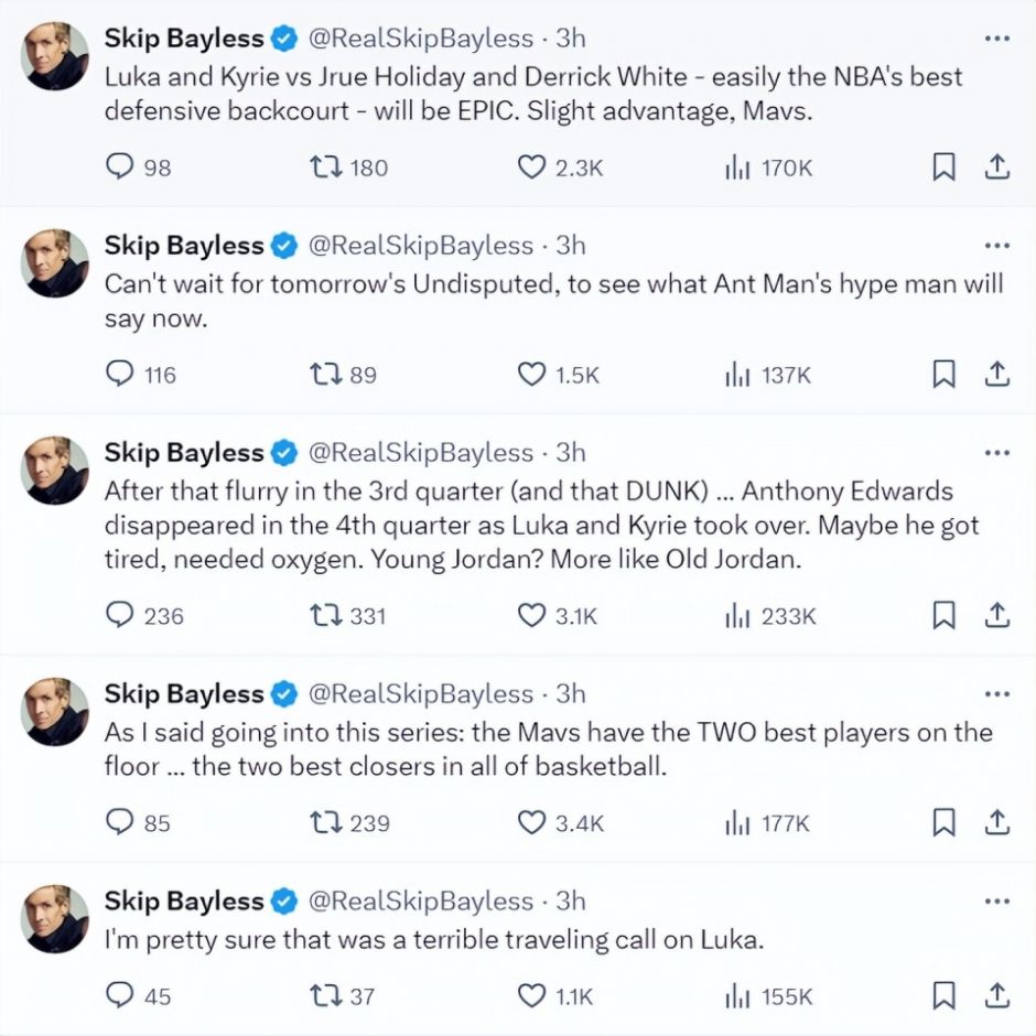 名嘴斯利普-贝勒斯评价:在爱德华兹经历了第三节的慌乱与那个隔扣后,他第四节直接隐身了,他这样的表现还说什么像年轻的迈克尔-乔丹?他这是年老即将退役的乔丹吧?他或许真的累了,需要吸氧吧。