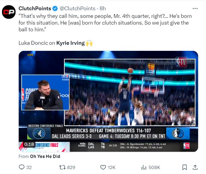东契奇盛赞欧文:他就是为关键时刻而生的,欧文是一个大心脏运动员,关键时刻我们都信任他。