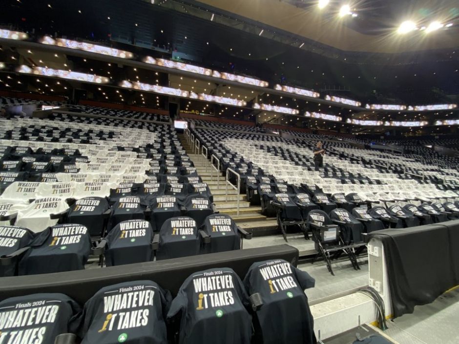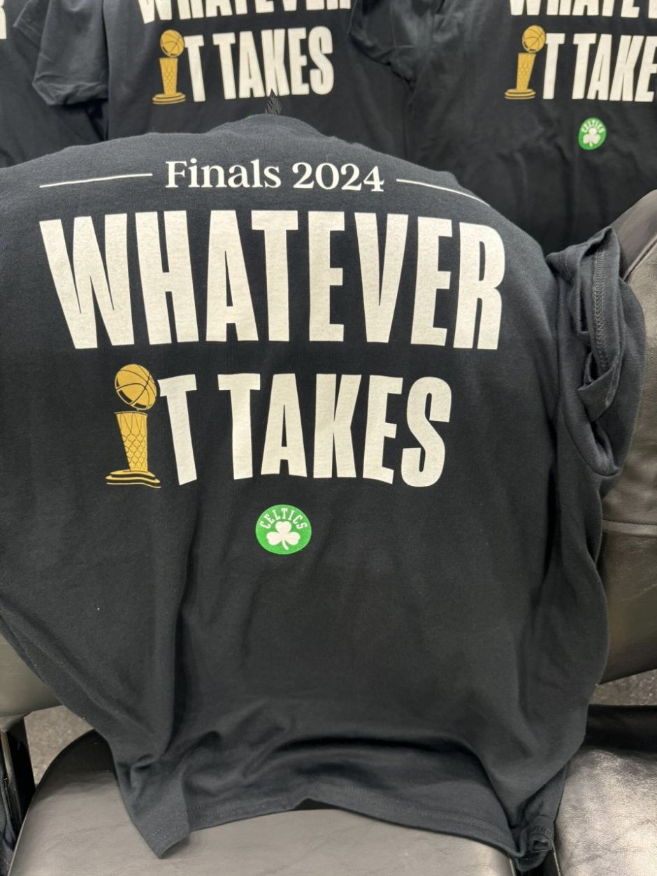 前方媒体拍下波士顿的主场布置,全场都铺满了助威T恤,T恤上的口号是WHATEVER IT TAKES,翻译过来就是不惜一切代价,其中的字母I用总冠军奖杯代替,他们不惜一切代价的目标,自然就是这座奥布莱恩奖杯。若绿军夺冠,他们的队史总冠军数量就将超过湖人,独占历史首位。这也是凯尔特人的一大动力。