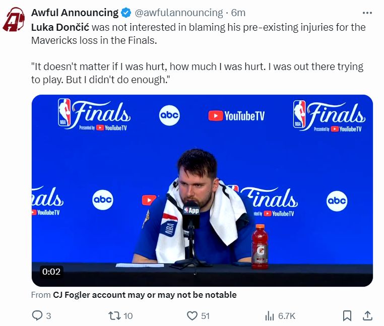 赛后东契奇说道:我们输球与我的伤病没有关系,不管我身上有多少伤都不能说是伤病导致总决赛失利,是我做得不够多,我就是试着努力登场打球。