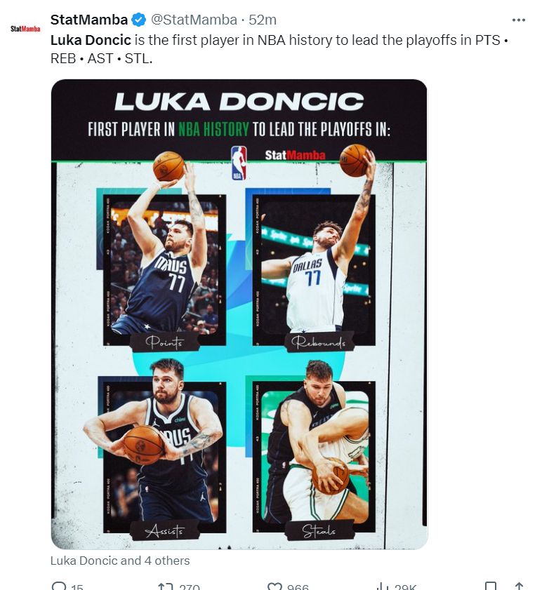 1.东契奇是NBA历史上第一,得分、助攻、篮板、抢断都全队第一带队进入总决赛的球员。
