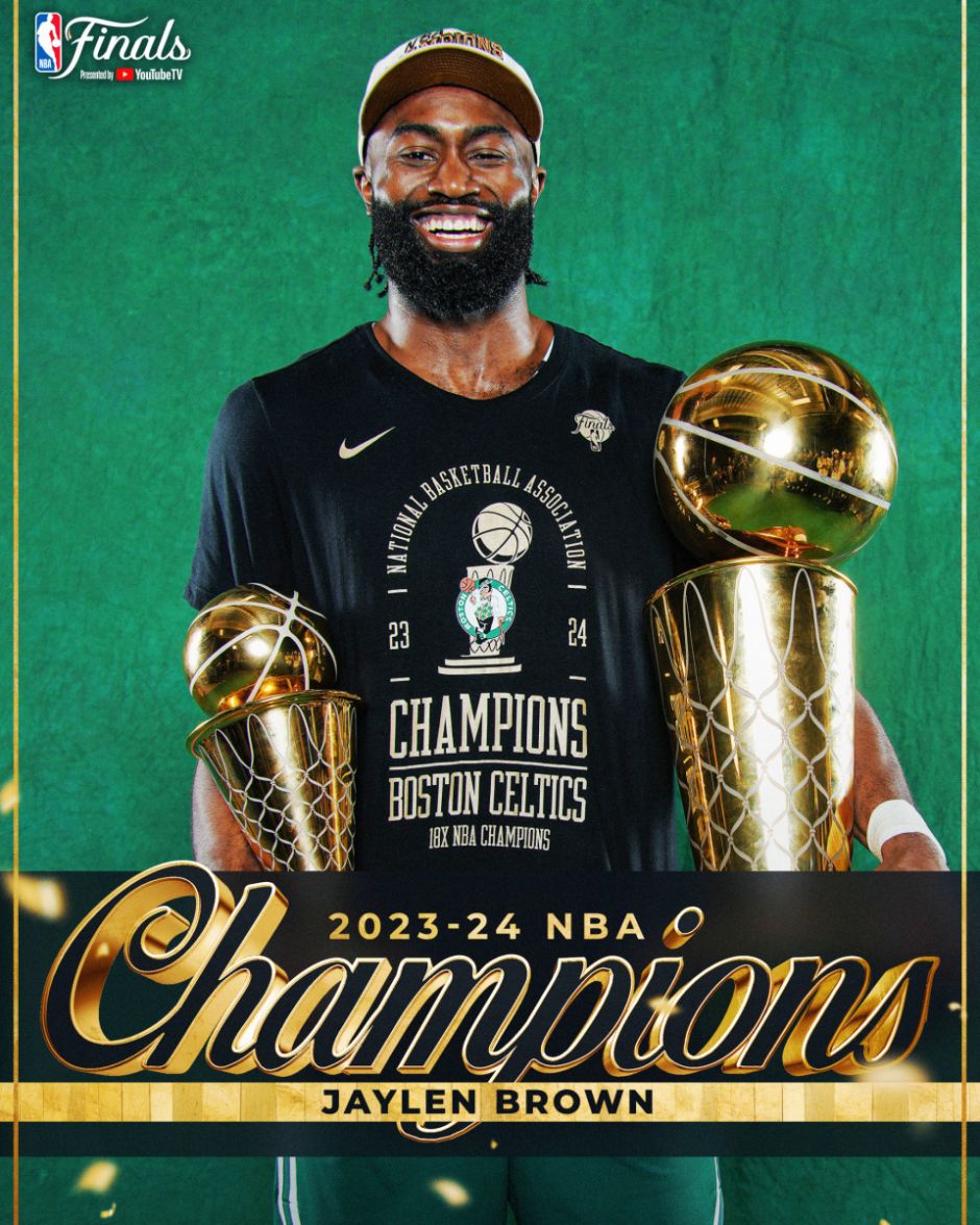 北京时间6月18日,凯尔特人夺得队史第18冠,布朗当选总决赛MVP。赛后,NBA官方社媒晒出了绿军全体成员的夺冠定妆照,并配上个人介绍。布朗手捧两座总冠军奖杯,塔图姆、霍乐迪等人都一脸笑容。这是他们本赛季甚至职业生涯中最值得庆祝的一天。