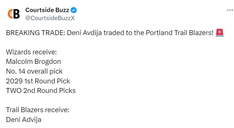 北京时间6月27日,据名记Woj报道,奇才和开拓者达成1换5交易,奇才送出阿夫迪亚,得到开拓者的布罗格登、今年的14号签、2029年位置第二高的首轮签、两个次轮签。