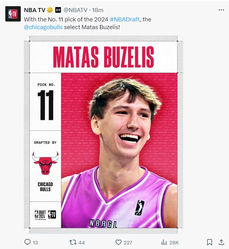 公牛在第十一顺位选中了点燃队的布泽利斯,他也是上半场一度被预测是状元的热门结果因为G联赛发挥不佳持续走低。