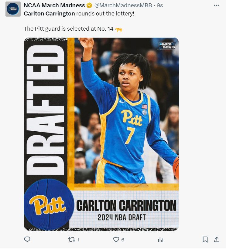 奇才用14顺位选择了卡尔顿-卡林顿,这位身高1.93米的后卫,上赛季场均13.8分5.2篮板4.1助攻。乐透全部出炉。