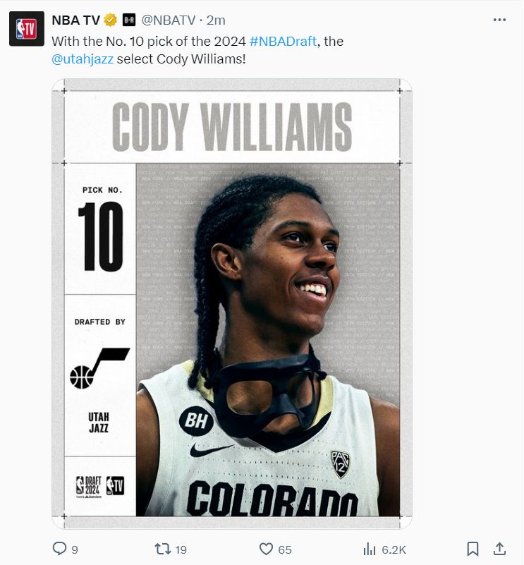 爵士用10号签选中了科罗拉多大学的锋线科迪-威廉姆斯,他是雷霆杰威的弟弟,尺寸是6尺8寸。