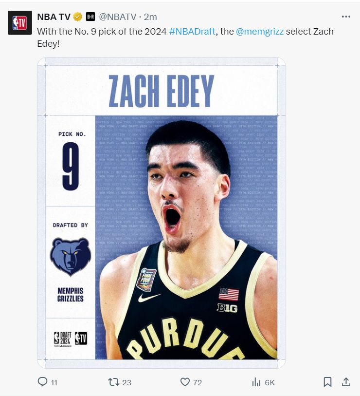 灰熊用9号签选中了加拿大中锋扎克-埃迪(周志豪),预测顺位一度是9-19,而且去年他是在次轮末,今年他直接第七,连续两年是全美最佳,身高2.24米。