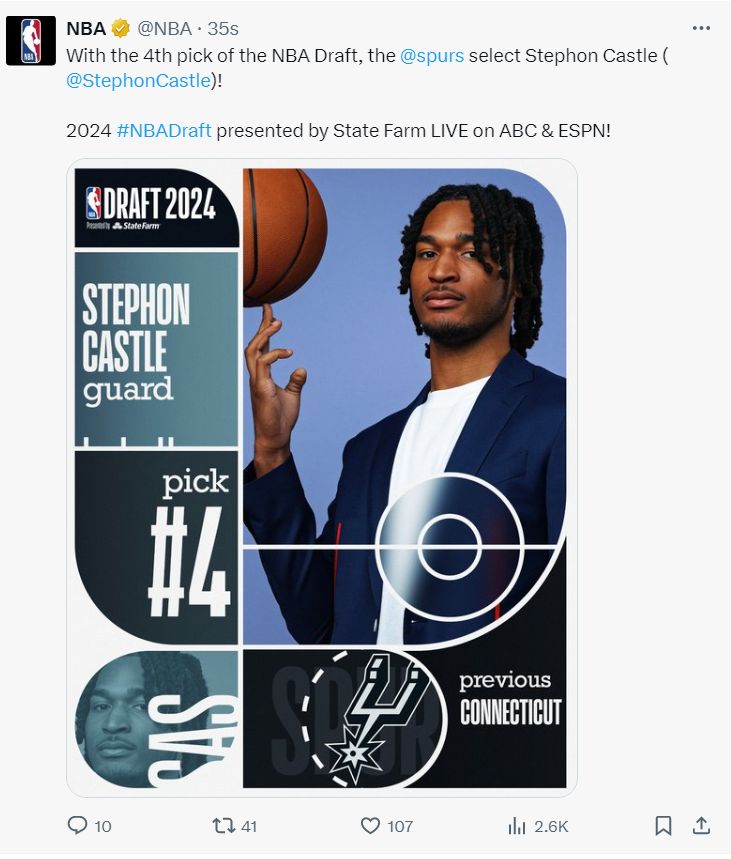 马刺在第四顺位选择了康大冠军后卫卡斯尔,一个尺寸很大的后卫,裸足1.97米,臂展2.06米,马刺一直都很喜欢他。