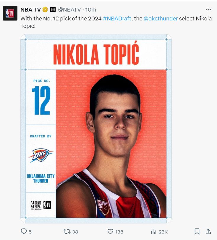 俄克拉荷马雷霆队用12号签选中了来自塞尔维亚的后卫尼古拉-托皮奇,这个选秀绝对是超级冷门,因为托皮奇一度的选秀顺位是前三,最次的顺位都是前五,最终因为伤病他掉到第12。
