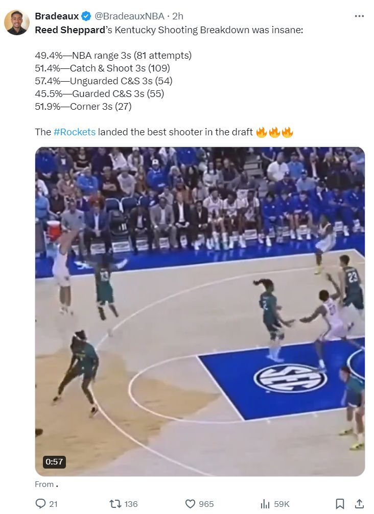 北京时间6月27日,休斯顿火箭队利用探花签选中了来自肯塔基大学的投手里德-谢泼德,这一个举动将改变休斯顿火箭未来1-2年的运作轨迹。