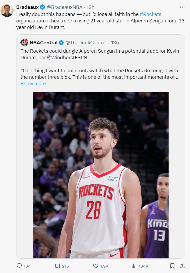 休媒立马转推发声:如果火箭用一个21岁的超级新星去换一个36岁的杜兰特,我会对火箭彻底失去信心。