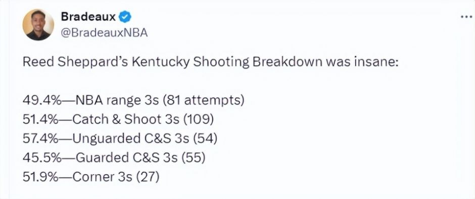 2023-24赛季为肯塔基大学出战了33场比赛,场均28.9分钟可以得到12.5分4.1篮板4.5助攻2.5抢断0.7封盖,投篮命中率53.6%,三分命中率52.1%,罚球命中率83.1%。这样的投篮数据,在NCAA赛场是比较罕见的。即便是库里、雷迪克等超级射手,大学时代也没有这么高的三分命中率。