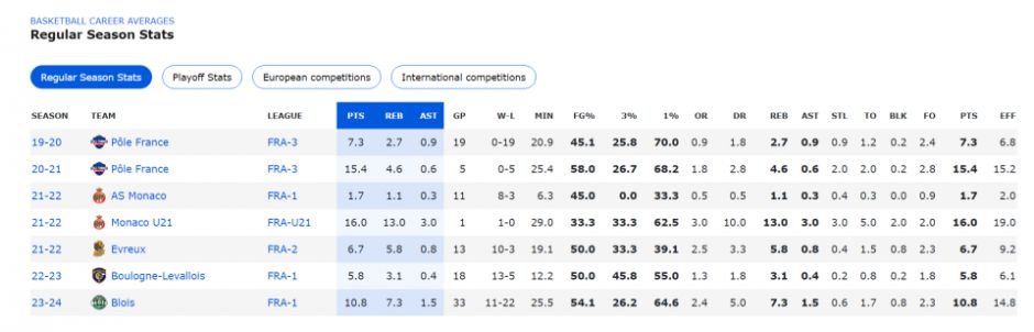 上赛季在法甲场均25.5分钟,拿到10.8分7.3篮板1.5助攻0.6抢断0.8盖帽,命中率54.1%,三分命中率26.2%。