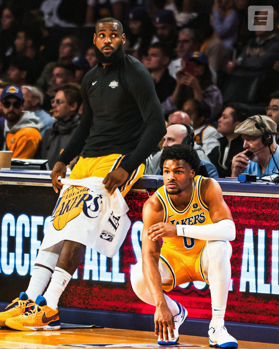 媒体ClutchPoints晒出詹姆斯父子三人的合照,并表示:“跟据报道洛杉矶湖人队准备提供一份3年1.62亿美元的续约合同,勒布朗-詹姆斯在球队将会效力到2026-27赛季。布莱斯-詹姆斯有资格在2026年进入NBA。”