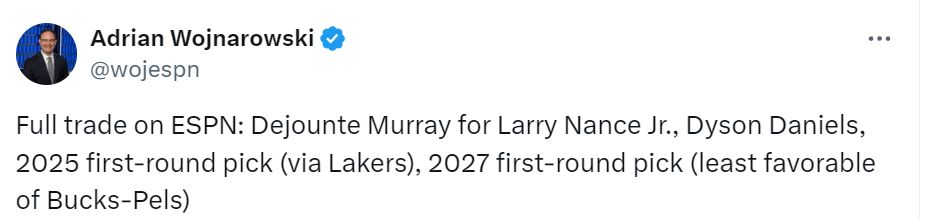北京时间6月29日,据名记Woj报道,老鹰和鹈鹕达成一笔交易,老鹰将德章泰-穆雷送往鹈鹕,换来鹈鹕的小南斯、丹尼尔斯和两个首轮签。这两个首轮签分别是2025年的湖人首轮签,2027年雄鹿和鹈鹕之中排名更靠后的首轮签。