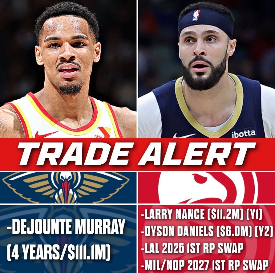 北京时间6月29日,NBA再次传来重磅交易,老鹰队与鹈鹕队完成一笔1换5大交易,前全明星控卫德章泰-穆雷被送往鹈鹕。