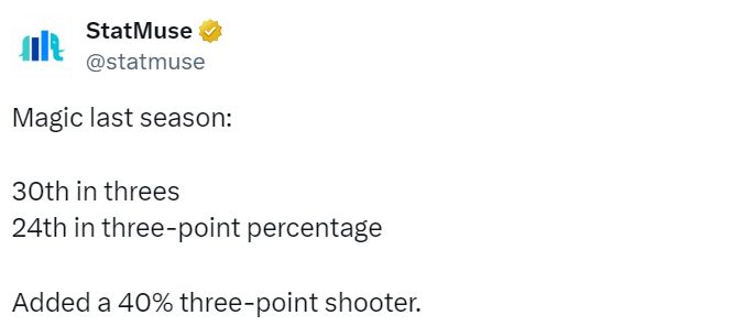 魔术上赛季的三分命中数排在联盟倒数第一,三分命中率排在第24位,增加了一位三分命中率达到四成的球员。打造一套潜在的首发是萨格斯+波普+小瓦格纳+班凯罗+卡特。