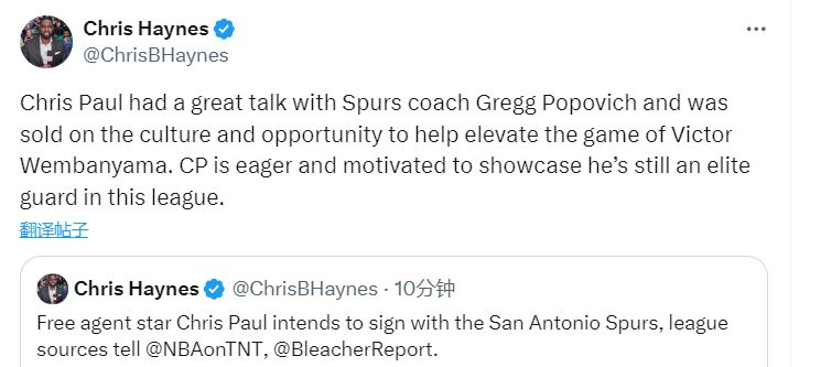 保罗为什么决定效力马刺?Haynes透露,保罗与马刺队教练波波维奇进行了一次愉快的交谈,他被这里的文化和机会所吸引,希望帮助文班亚马提升比赛水平。保罗还渴望并有动力证明自己仍然是这个联盟的精英后卫。