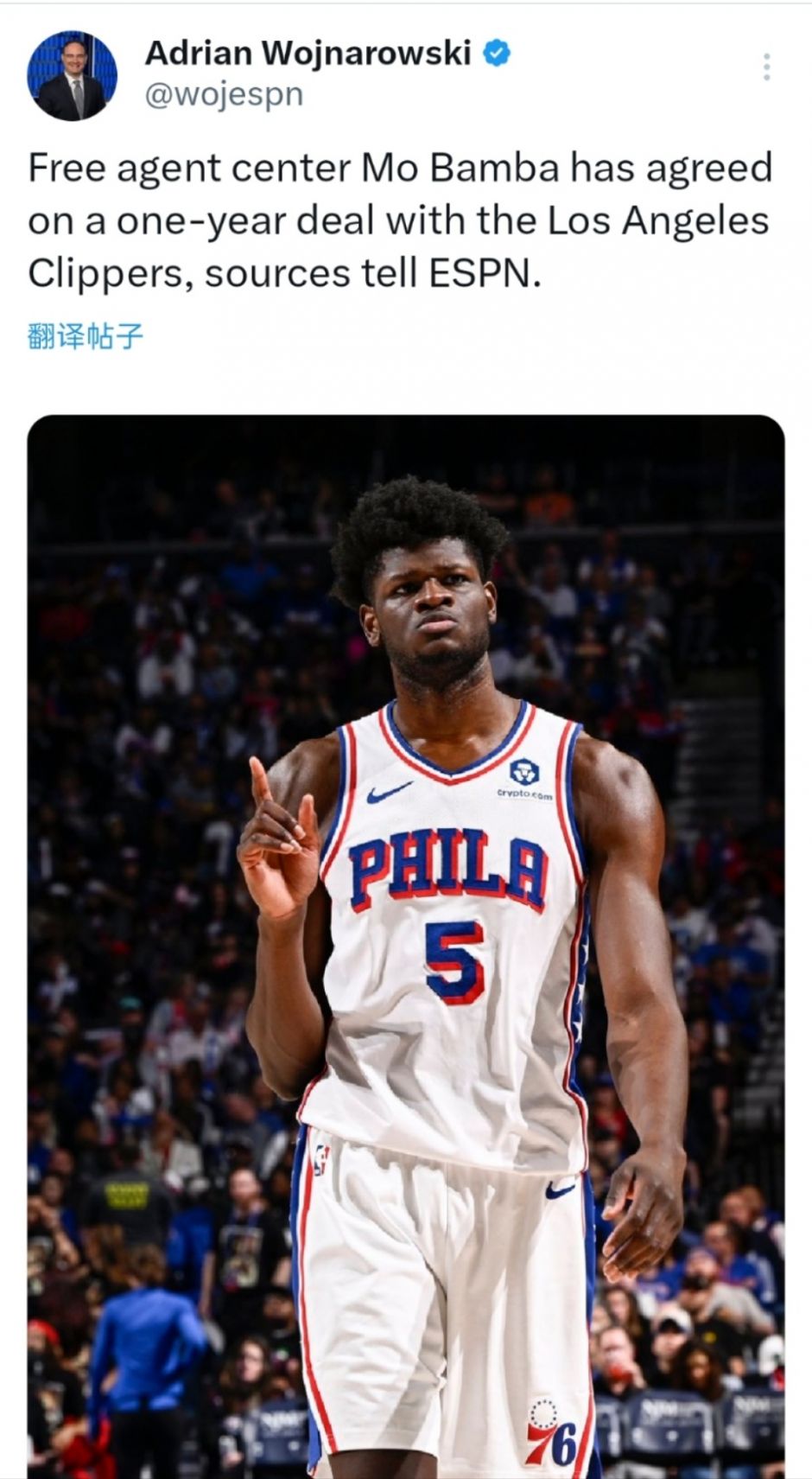 在普拉姆利一年330万美元加盟太阳后,快船如今签约班巴,自然是给祖巴茨找到又一位替补内线。