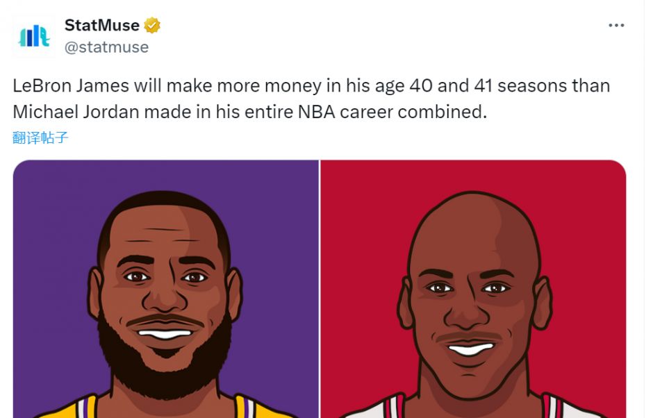 数据网站显示,詹姆斯在40岁和41岁所赚取到的薪水,将比乔丹整个NBA生涯加在一起还要多。