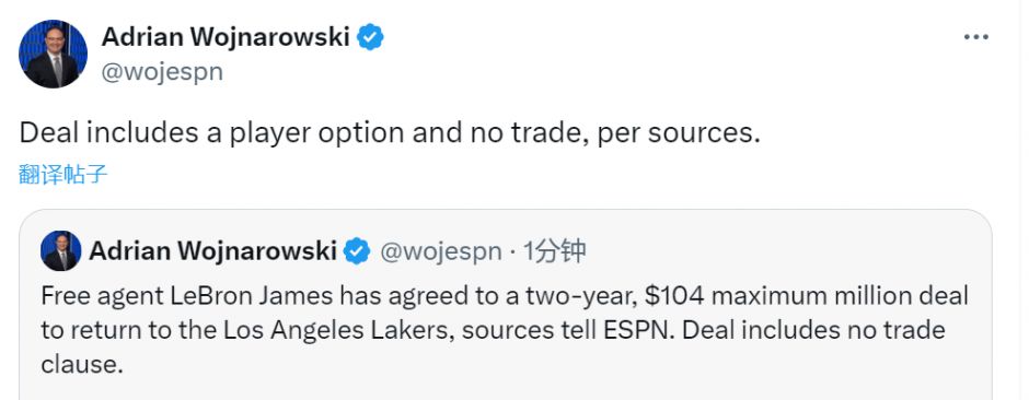 北京时间7月3日,据名记Woj报道,自由球员勒布朗-詹姆斯已经同意与湖人签下2年1.04亿美元的合同。这笔合同是一份1+1的合同,第二年是球员选项,并且带有交易否决权。