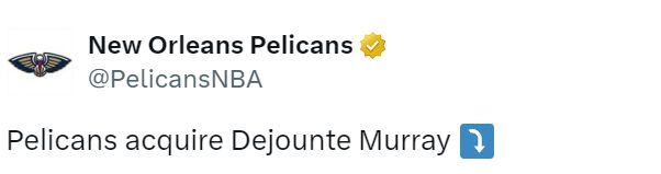 北京时间7月7日,鹈鹕官方宣布已经从老鹰正式换来后卫德章泰-穆雷,具体的交易方案也从5换1升级为6换1,他们把科迪-泽勒也加入其中,最终变成鹈鹕送出小南斯、戴森-丹尼尔斯、利德尔、科迪-泽勒、2025年来自湖人的首轮、2027年鹈鹕和雄鹿中顺位更低的那个首轮,得到穆雷。