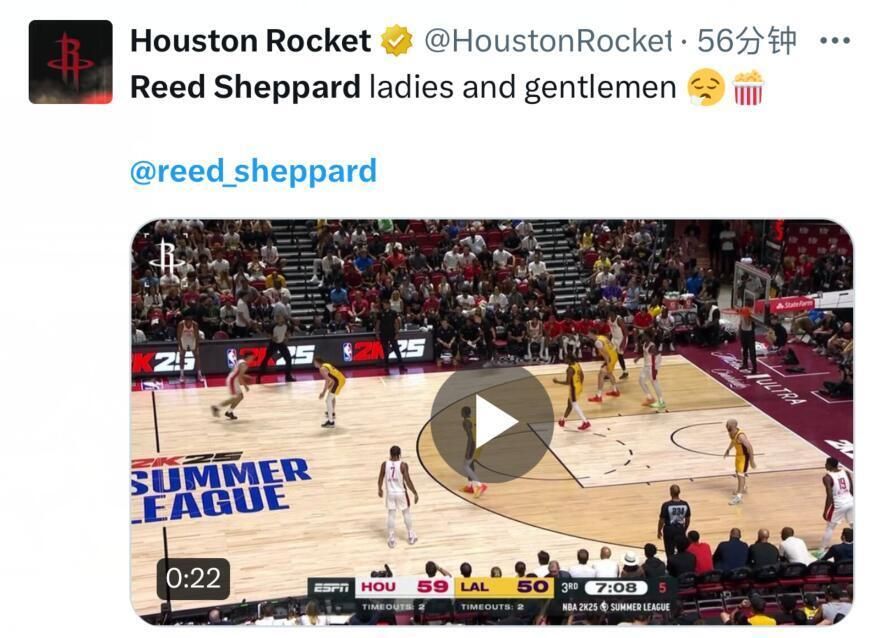 NBA官方晒出谢泼德比赛视频并配文:“3号秀里德谢泼德在他的夏季联赛首秀表现出色,带领火箭队取得胜利”;
