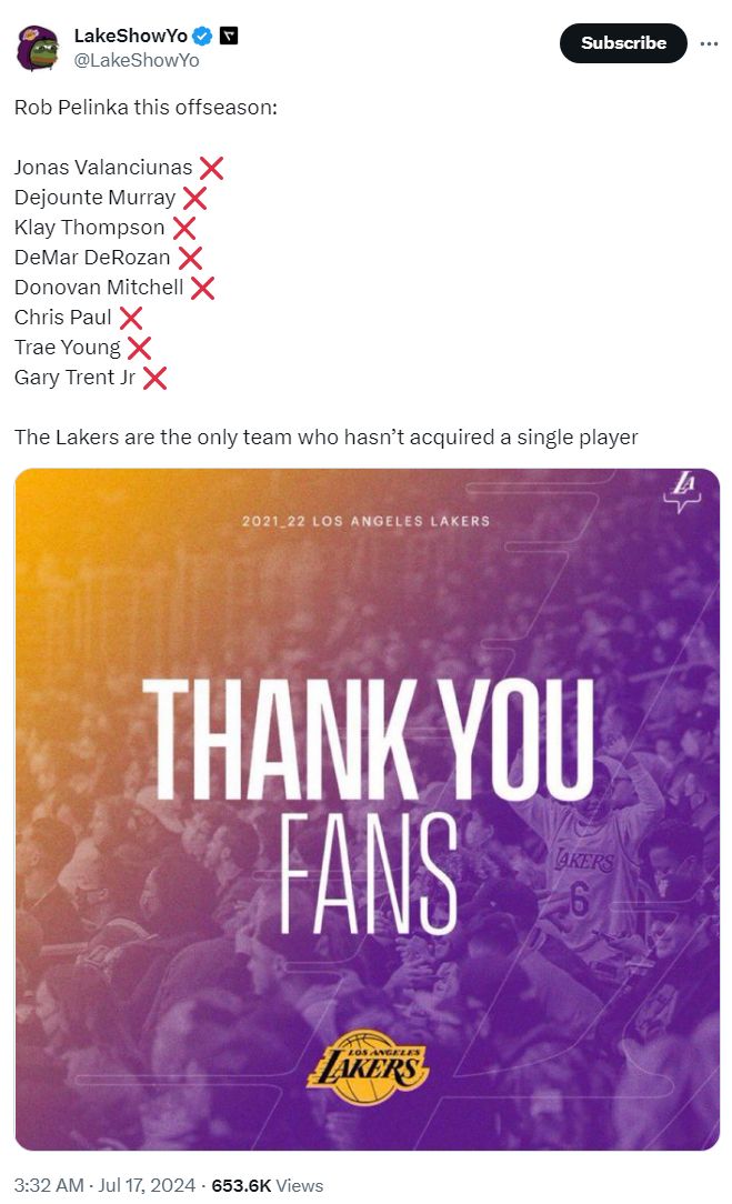 湖人媒体晒出了交易截止日后湖人没有任何运作佩林卡的言论,当时信誓旦旦的说球队会在夏天做出改变,球队会在休赛期对阵容进行调整。结果到了休赛期又是0运作。