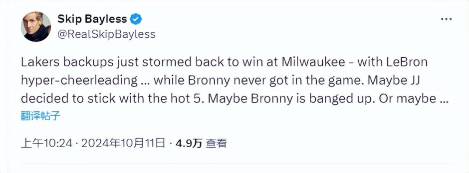 名嘴斯基普·贝莱斯点评了这场比赛:“湖人的替补们刚刚逆转战胜了雄鹿——而勒布朗是超级拉拉队员,而布朗尼好像从来没有进入到比赛中。也许雷迪克决定用手感火热的五个人。也许布朗尼受伤了,或者……”