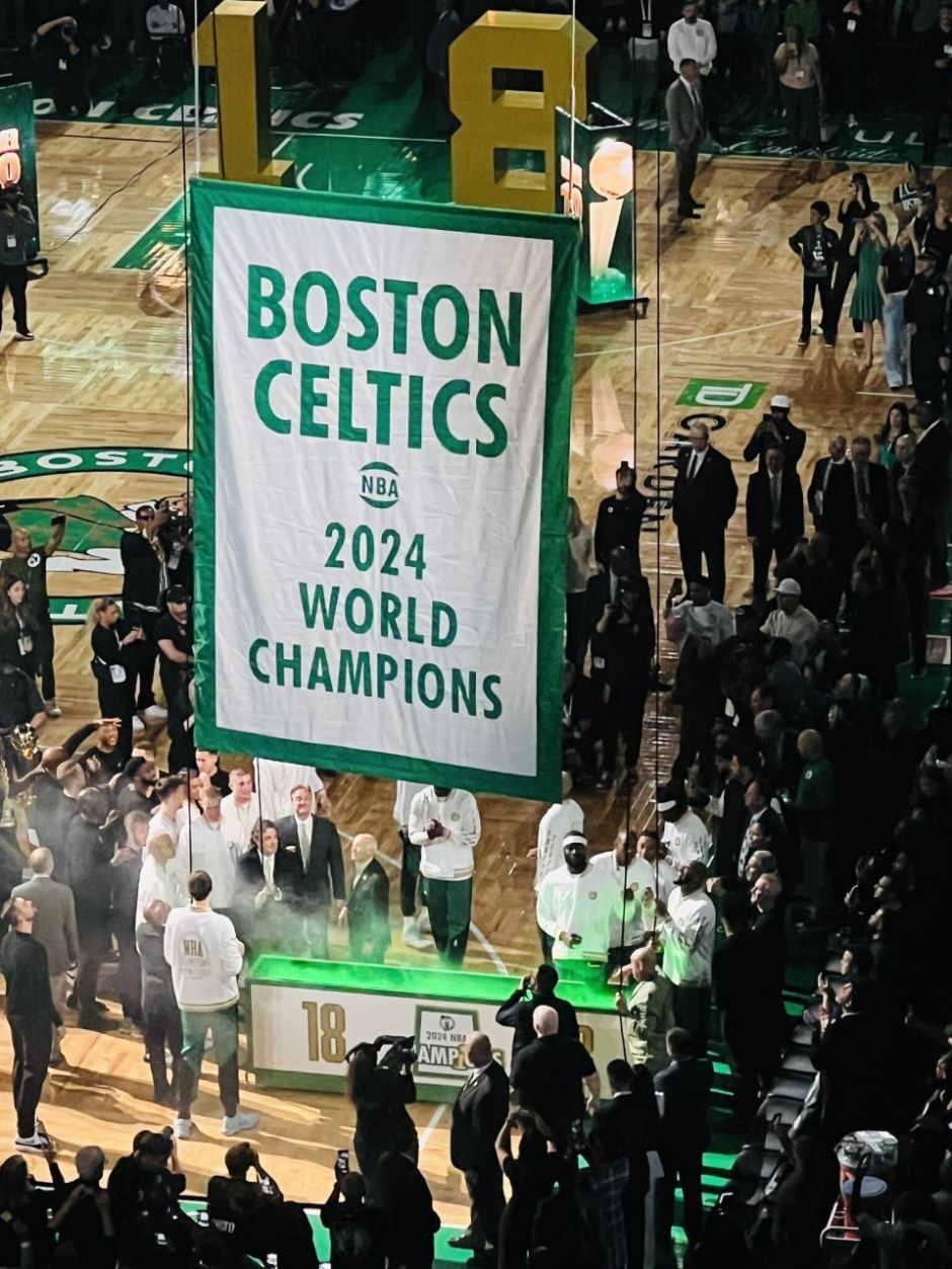 赛前,凯尔特人举行总冠军颁奖仪式,主帅马祖拉出场时亲吻地板,凯尔特人主场球馆升起第18面总冠军旗帜。