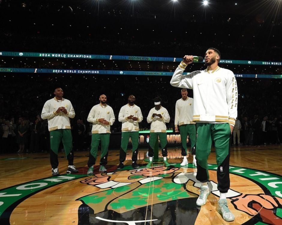 塔图姆等一众球员领取上赛季的总冠军戒指,塔图姆作为球员代表发言,豪言“让我们再夺一冠!”