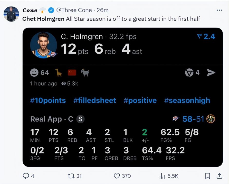 北京时间10月25日,雷霆客场以102-87击败掘金。这场比赛切特-霍姆格伦的表现十分出彩,他用硬实力证明了他是这个联盟最顶级的大个子之一,也打脸ESPN百大球星排名,他仅仅32,文班亚马竟然11。