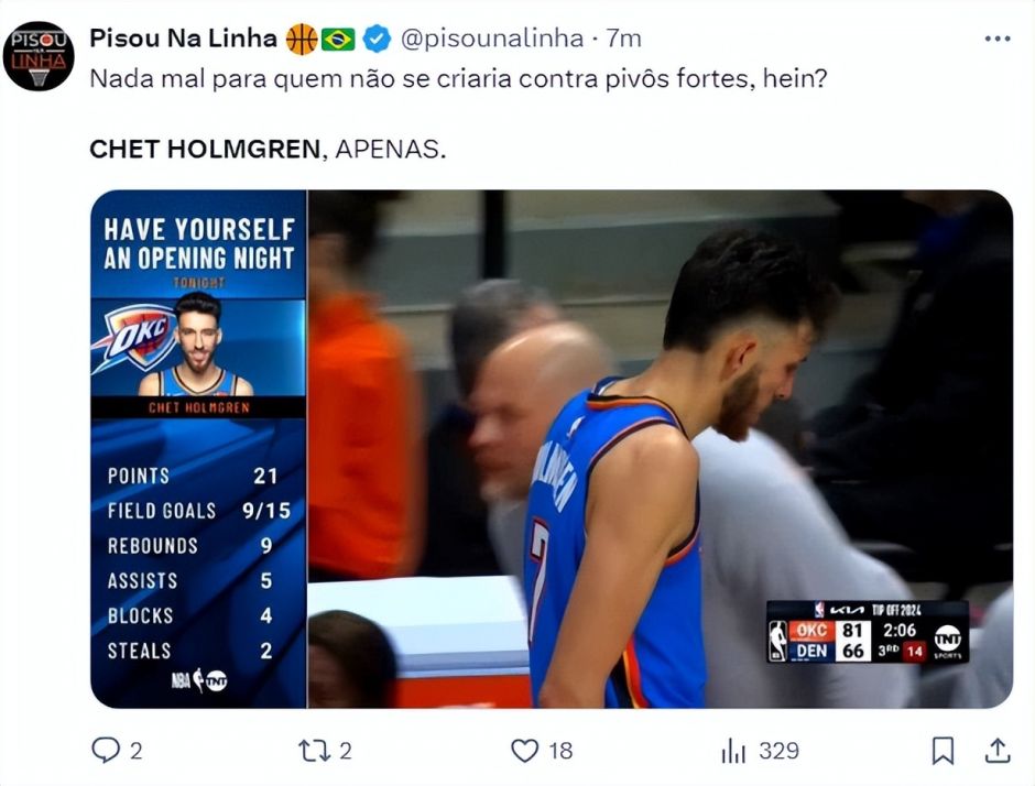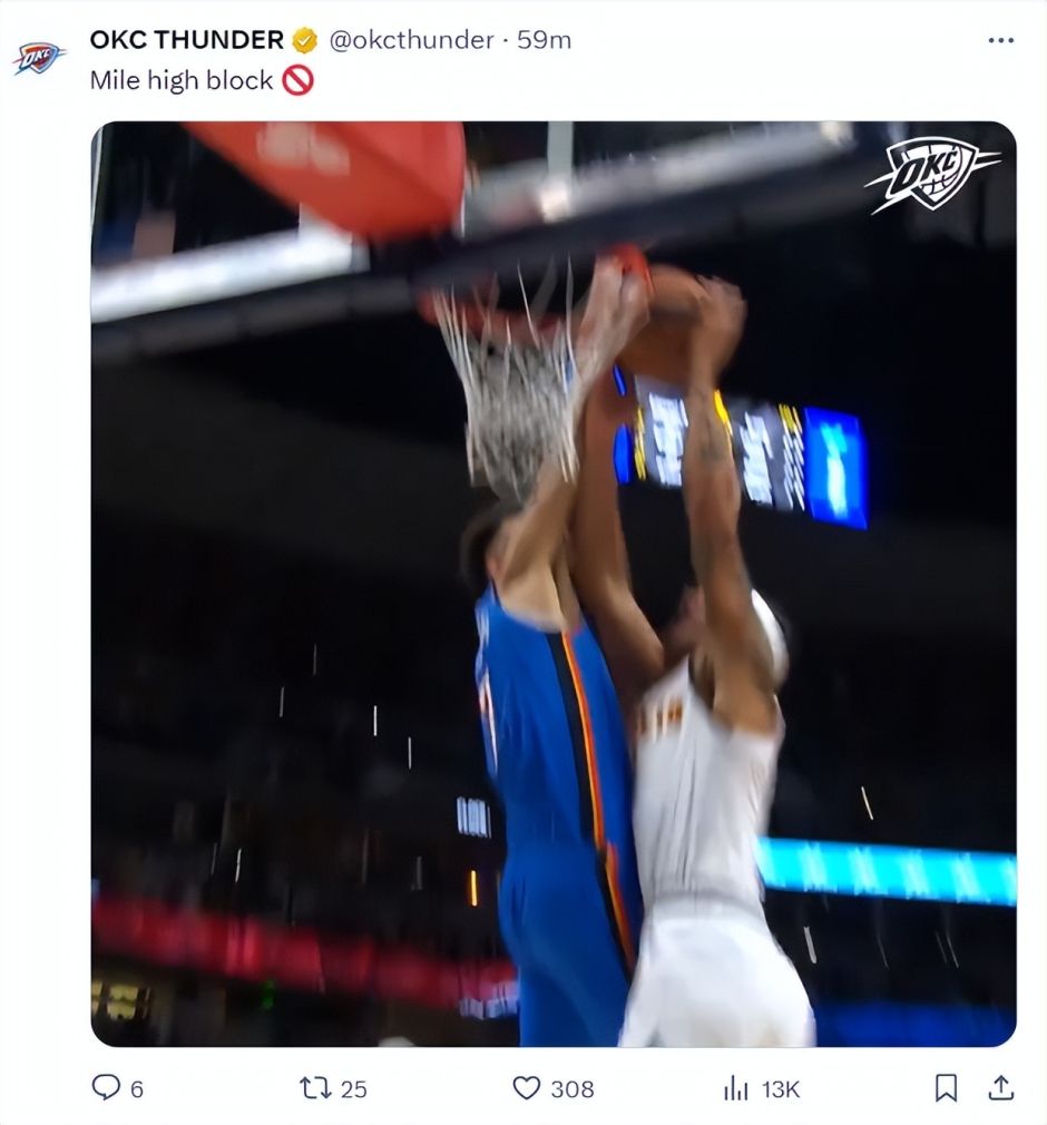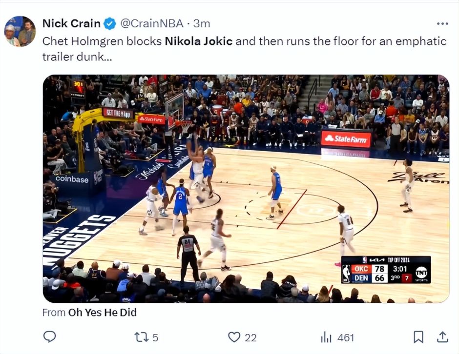 第三节霍姆格伦大帽约基奇,随后快攻完成了暴扣,霍姆格伦单节7中4拿到9分3篮板1助攻3盖帽,单节3个盖帽平生涯最高,三节打完15中9拿到21分9篮板5助攻2抢断4盖帽,表现已经超过了约基奇。