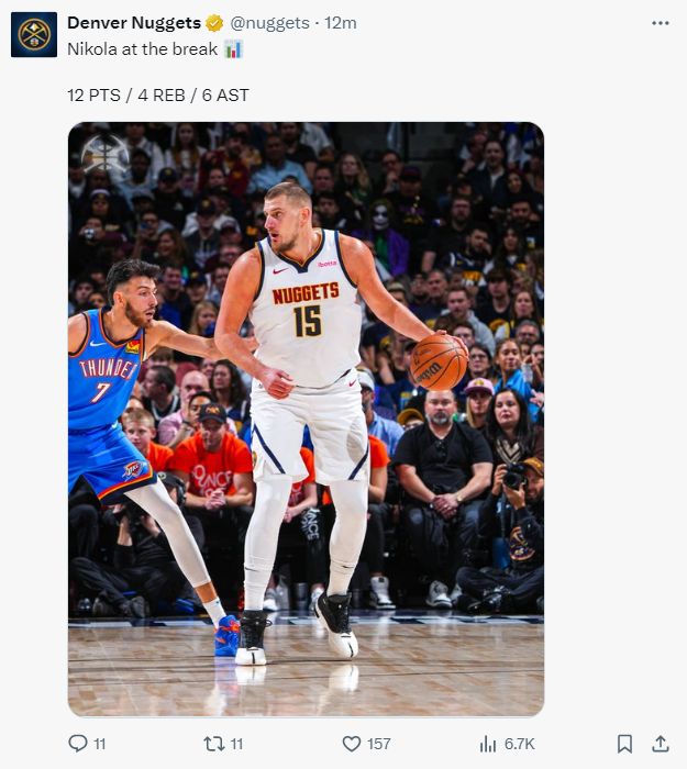 半场打完约基奇18分钟,12分6助攻4篮板,约基奇的数据实际上跟霍姆格伦差不多,亚历山大上半场12分2篮板2助攻1抢断1盖帽,所以雷霆就一路领先。